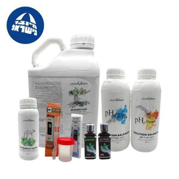 ערכת השלמה לצורך תחזוקה ודישון לטיפול במערכת הידרופונית במקצועיות. הערכה כוללת ציוד מדידה, דשן ומאזני PH הנדרשים לטיפול שבועי במערכת ההידרופונית שלכם.